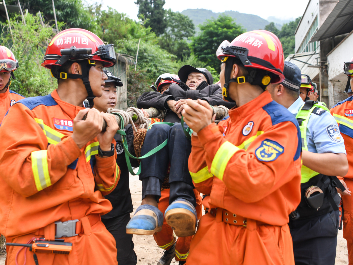 Firefighters relocate an elderly villager affected by flooding in Xinhua village in Hanyuan county, Ya'an, Sichuan province, on Sunday. (WANG XI/XINHUA)