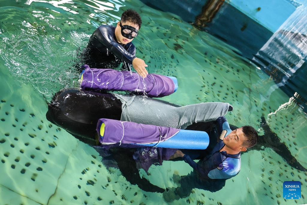 A veterinarian (L) administers liquid and medicine to a short-finned pilot whale via a stomach tube at Sanya Haichang Animal Conservation Center in Sanya, south China's Hainan Province, July 20, 2024. (Xinhua/Zhang Liyun)