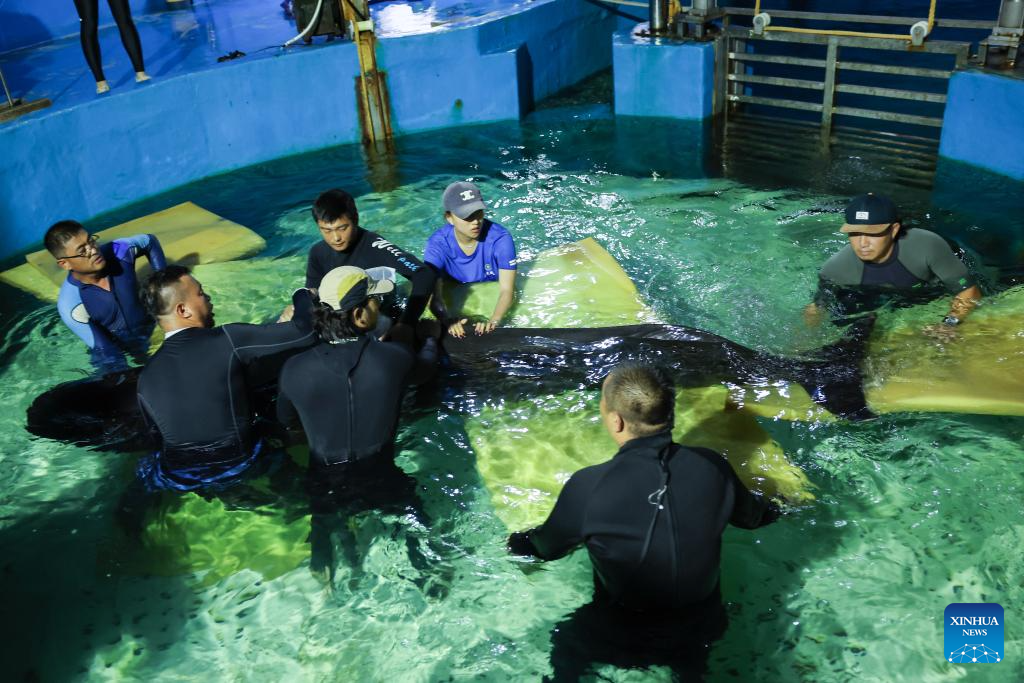 A veterinarian (1st L) dredges the stomach tube for a short-finned pilot whale at Sanya Haichang Animal Conservation Center in Sanya, south China's Hainan Province, July 20, 2024. (Xinhua/Zhang Liyun)
