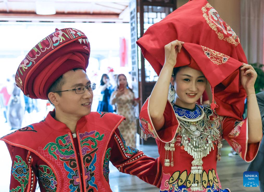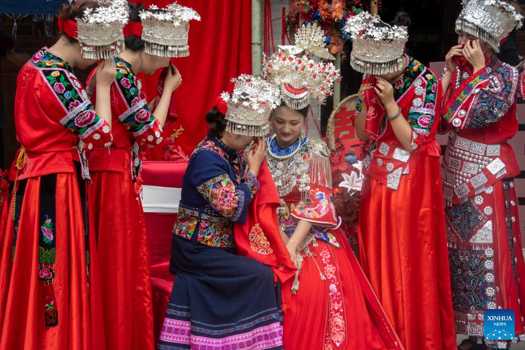 A wedding with Miao ethnic group features is pictured at Chiyou Jiuli Town scenic spot of Pengshui Miao-Tujia Autonomous County, southwest China's Chongqing, July 20, 2024. Local authorities of Pengshui Miao-Tujia Autonomous County has taken advantages of ethnic features to promote its summer tourism. (Photo by Li Xiaoguo/Xinhua)