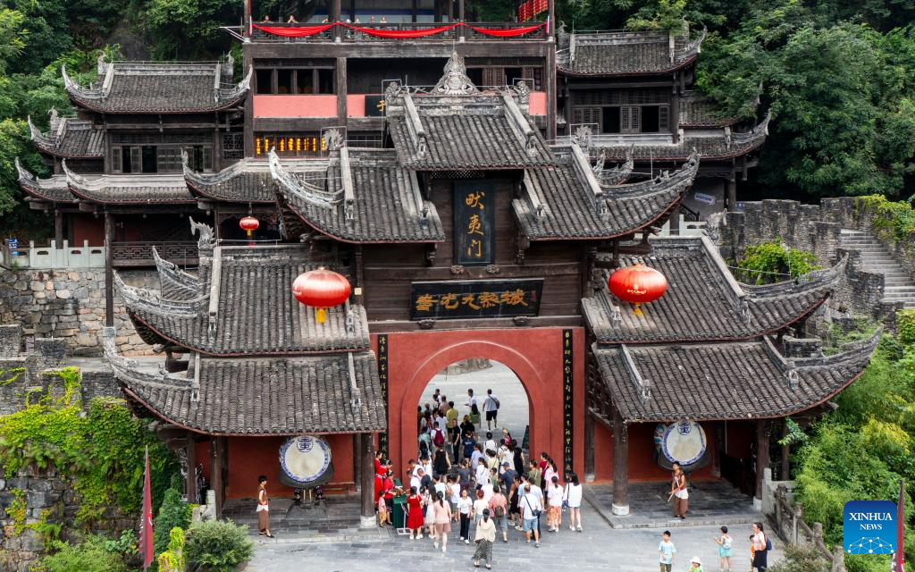 This aerial photo taken on July 20, 2024 shows tourists visiting Chiyou Jiuli Town scenic spot of Pengshui Miao-Tujia Autonomous County, southwest China's Chongqing. Local authorities of Pengshui Miao-Tujia Autonomous County has taken advantages of ethnic features to promote its summer tourism. (Xinhua/Liu Chan)