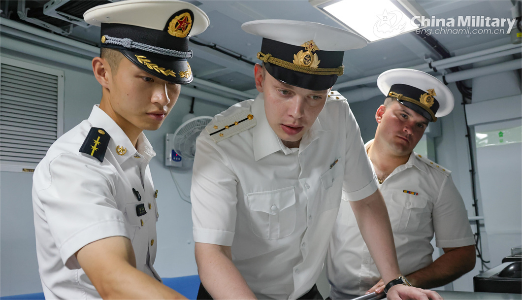 Chinese and Russian naval officers communicate with each other during the China-Russia joint naval exercise coded Exercise Joint Sea-2024 on July 13, 2024. (eng.chinamil.com.cn/Photo by Luan Cheng)