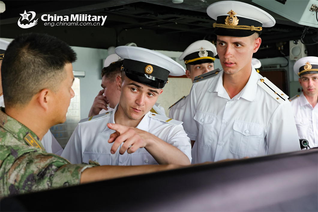 A Chinese naval officer answers questions asked by visiting Russian sailors about the Chinese vessel during the China-Russia joint naval exercise coded Exercise Joint Sea-2024 on July 13, 2024. (eng.chinamil.com.cn/Photo by Luan Cheng)