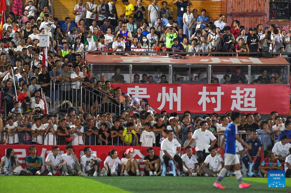 Spectators watch the final match between Dangxiang Village and Dongmen Village at the Village Super League in Rongjiang County of southwest China's Guizhou Province, July 20, 2024. (Xinhua/Yang Wenbin)