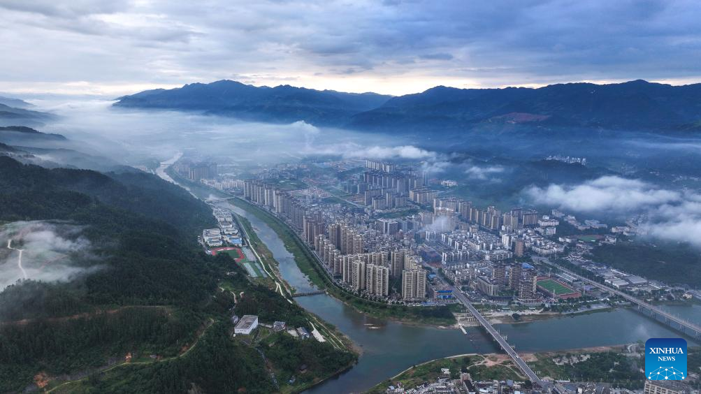 An aerial drone photo taken on July 20, 2024 shows the view of Rongjiang County in southwest China's Guizhou Province where the final match of the Village Super League is held. (Xinhua/Yang Wenbin)