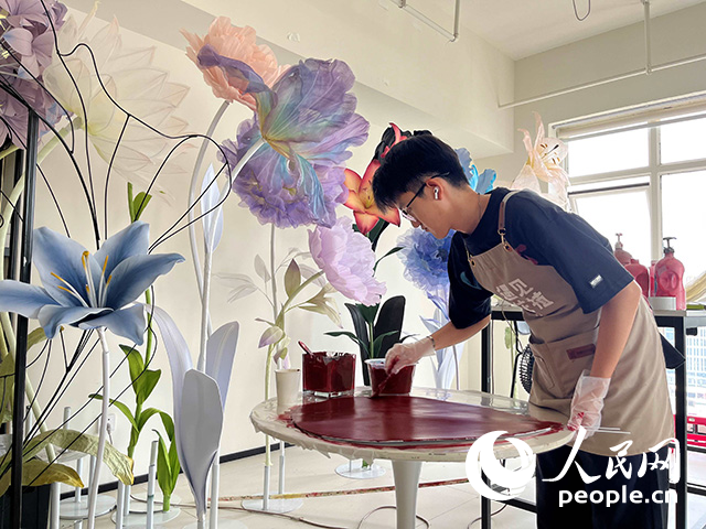 A staff member of Yunnan Huawu Technology Co., Ltd. makes paper flowers. (People's Daily Online/Yin Xin)