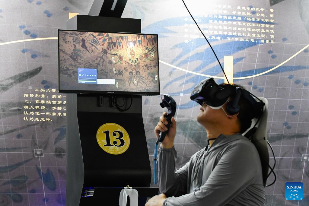 A visitor uses virtual reality (VR) equipment to visit the Mogao Grottoes in Dunhuang, northwest China's Gansu Province, July 22, 2024. (Xinhua/Lang Bingbing)