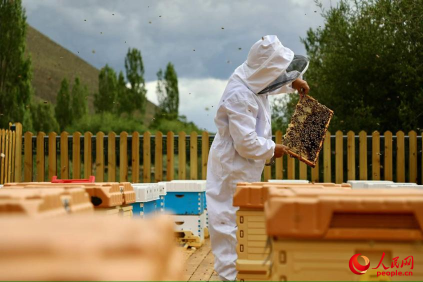 A staff member checks on the growth of honey bees at a bee farm in Shannan, southwest China's Xizang Autonomous Region. (People's Daily Online/Tsering Norbu)