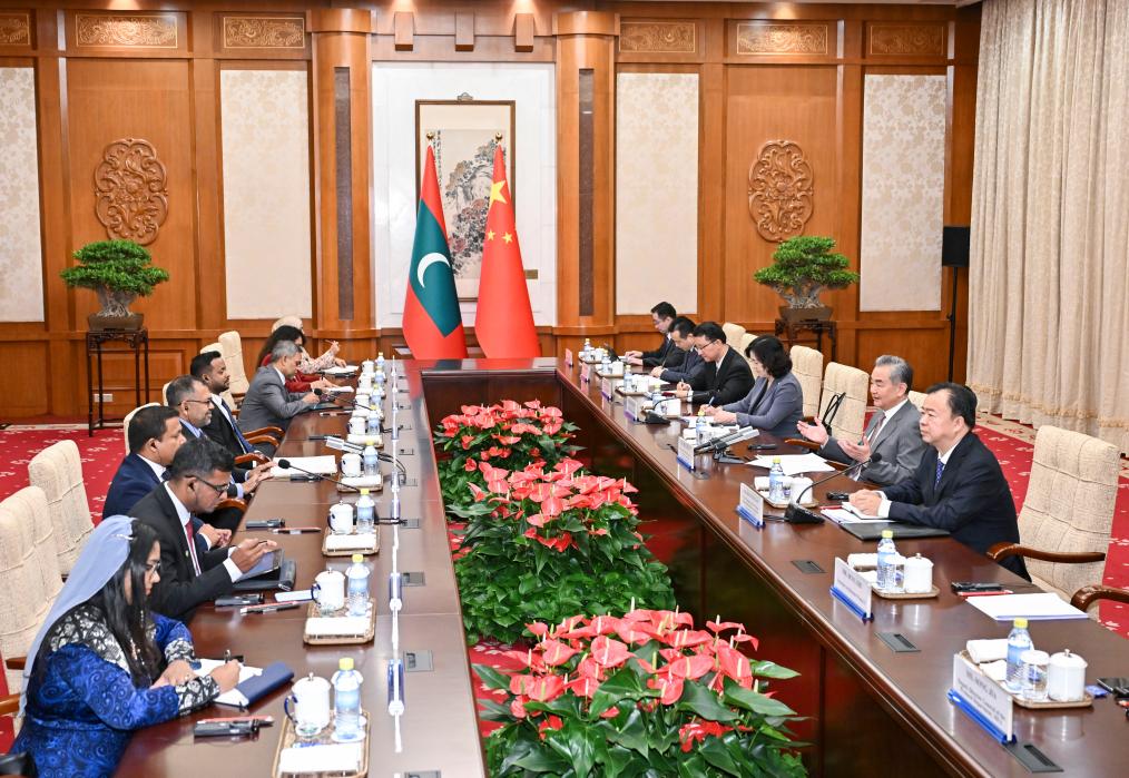 Wang, also a member of the Political Bureau of the Communist Party of China Central Committee, said that China and the Maldives have continuously given each other mutual respect and support since the two sides established diplomatic ties 52 years ago. China-Maldives relations have been a good example of equality and win-win cooperation between countries of different sizes.