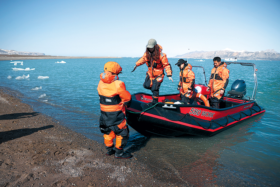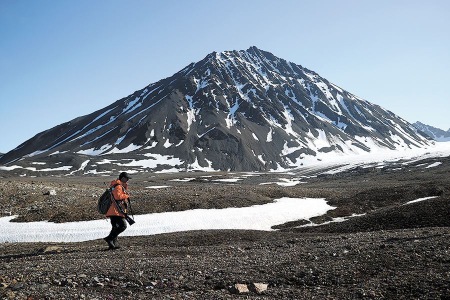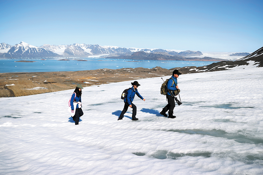 Members of the Chinese Arctic expedition team set out for sampling work in Ny-Alesund, Norway, on June 22. A member carries a firearm for protection in the wild. (ZHAO DINGZHE/XINHUA)