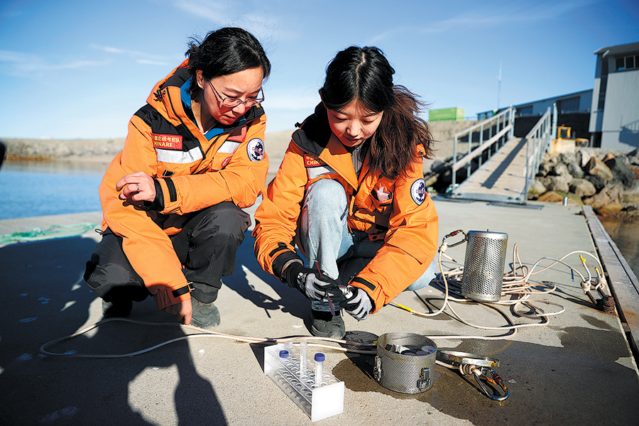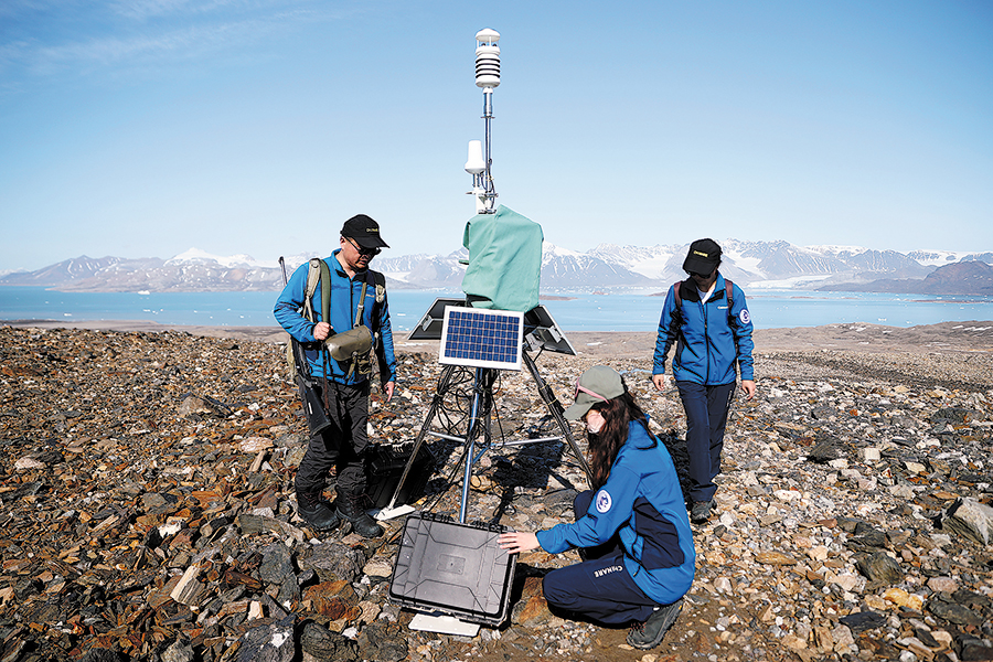 Chinese Arctic expedition team members discuss work at the Yellow River Station in Ny-Alesund, Norway, during an inspection of sampling equipment on June 21. (ZHAO DINGZHE/XINHUA)