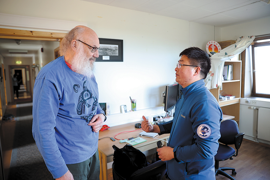 A Chinese Arctic expedition team member (right) speaks with an expert from the Norwegian Polar Institute at the Yellow River Station in Ny-Alesund, Norway, on June 21. (ZHAO DINGZHE/XINHUA)