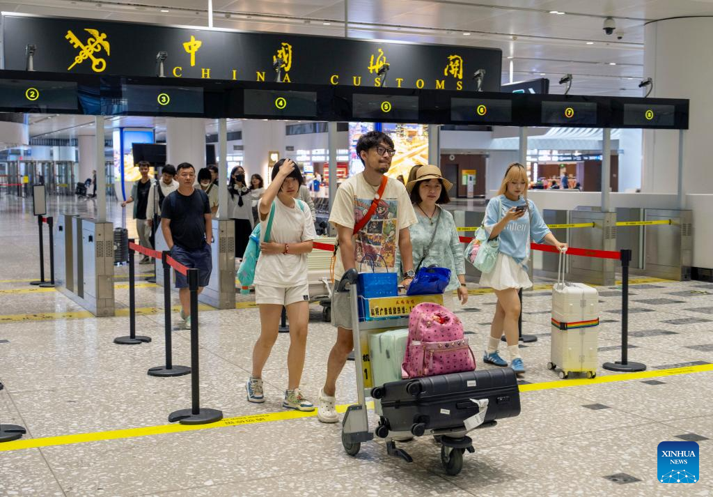 Travelers pass through customs at Beijing Daxing International Airport in Beijing, capital of China, July 18, 2024. With easier entry policies, including a 144-hour visa-free transit policy that expanded to 37 entry ports as of July 15 and pilot visa-free policies for some countries, "on-a-whim travel" to China is becoming a reality. (Xinhua/Li He)