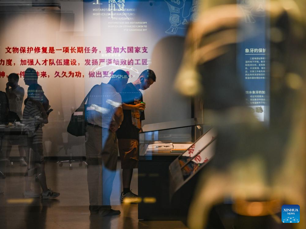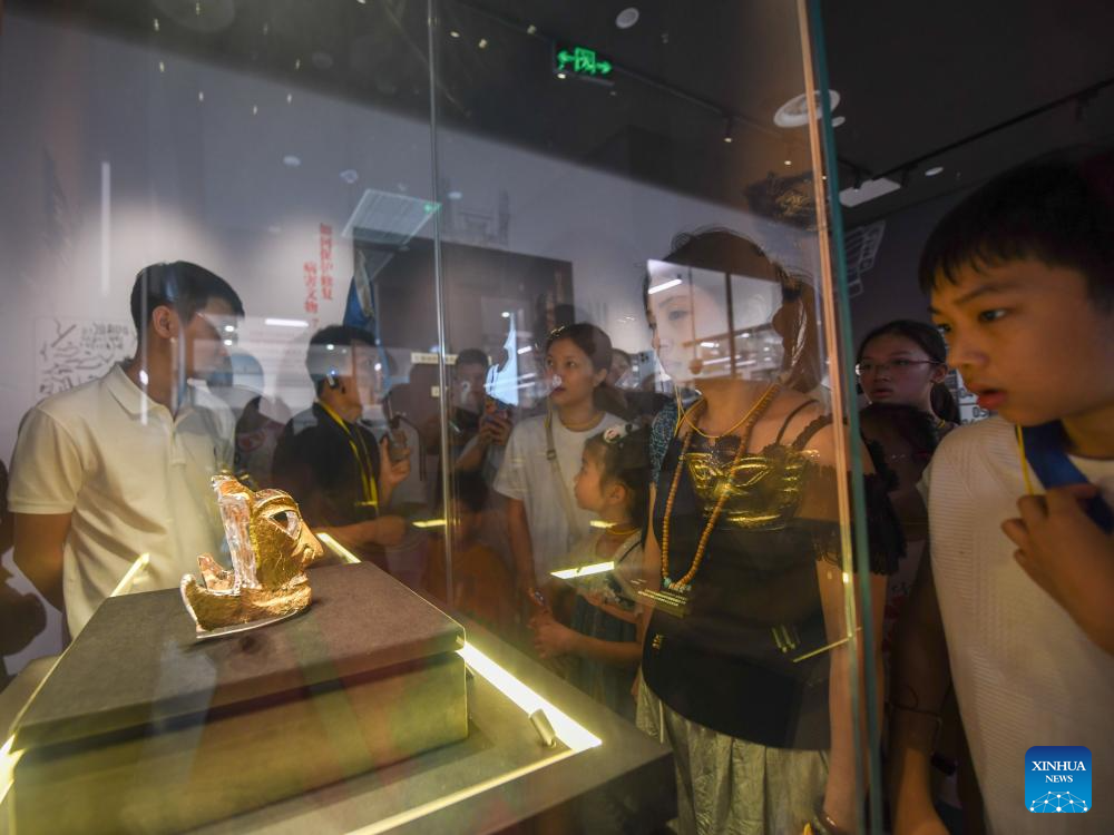 Tourists visit the trial preview of an exhibition at the Sanxingdui Museum in Guanghan City, southwest China's Sichuan Province, July 22, 2024. (Xinhua/Tang Wenhao)