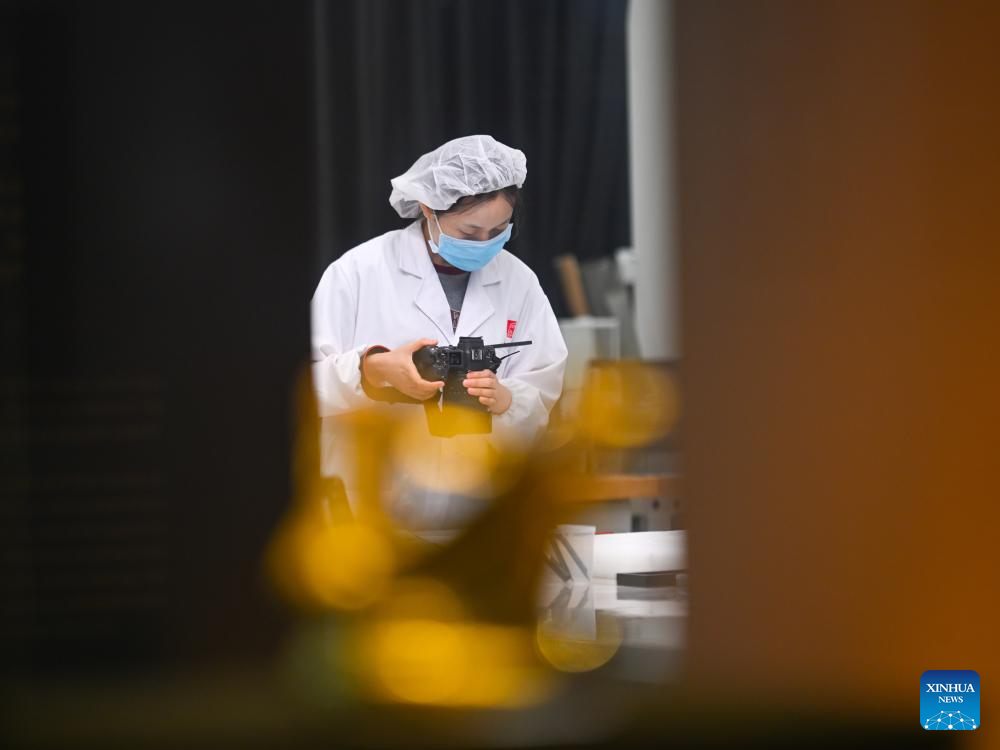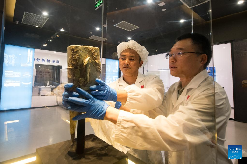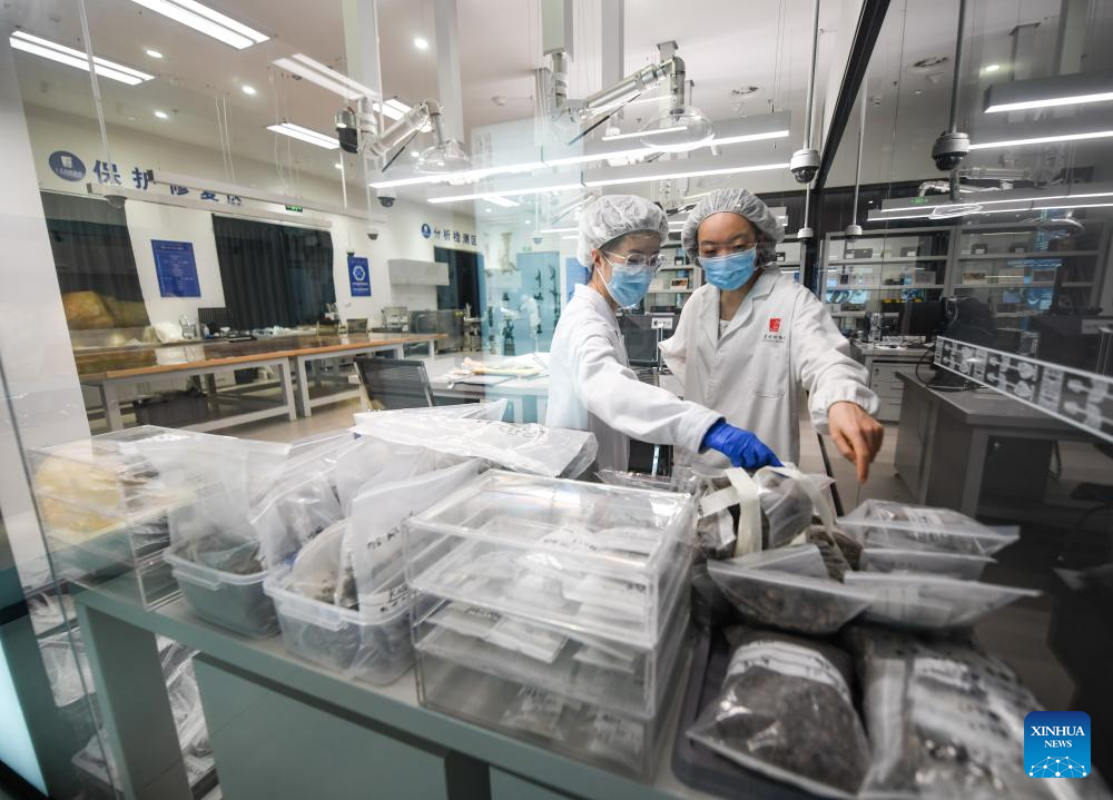 Staff members check soil samples at the Sanxingdui Museum in Guanghan City, southwest China's Sichuan Province, July 23, 2024. (Xinhua/Wang Xi)