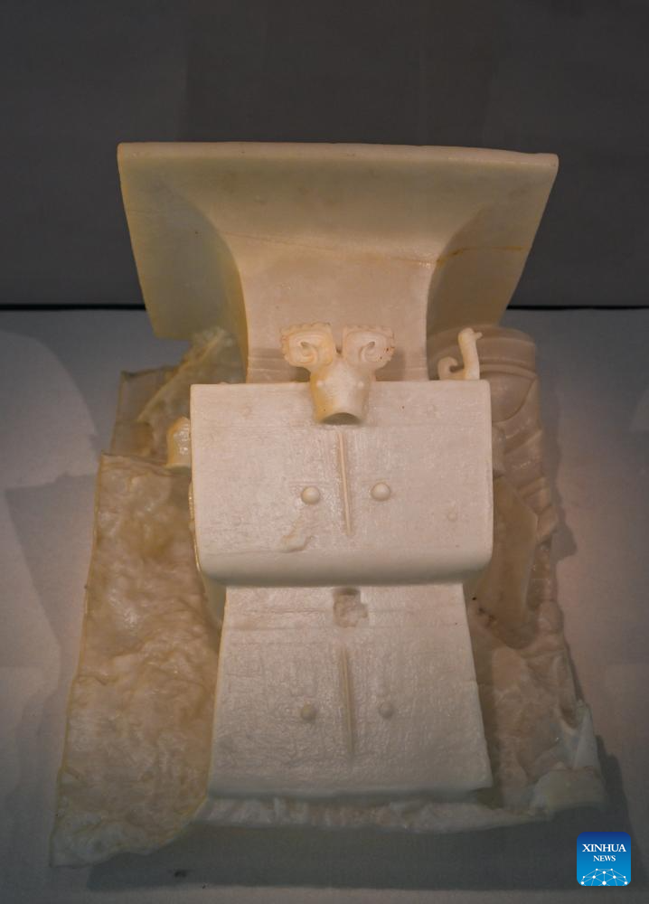 A 3D-printed copy and silicone rubber of a bronze zun (an ancient wine vessel) is displayed at the Sanxingdui Museum in Guanghan City, southwest China's Sichuan Province, July 23, 2024. (Xinhua/Wang Xi)