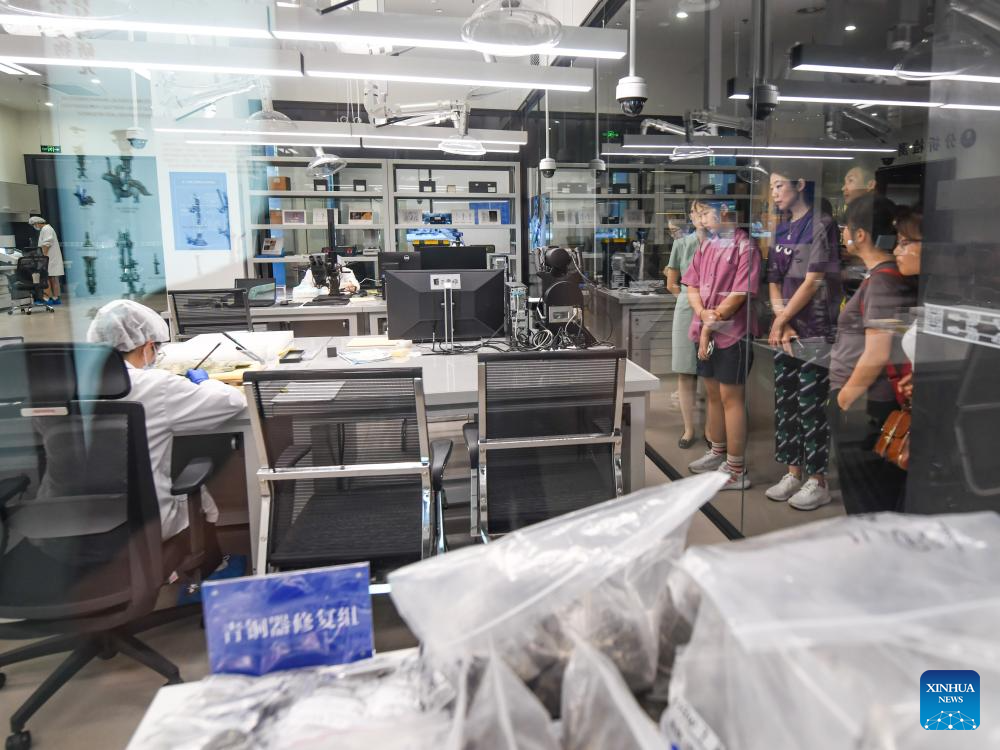 Tourists view the restoration of cultural relics at the Sanxingdui Museum in Guanghan City, southwest China's Sichuan Province, July 23, 2024. (Xinhua/Wang Xi)