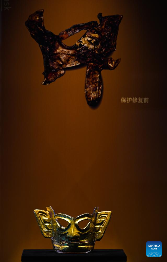 A restored golden mask is displayed at the Sanxingdui Museum in Guanghan City, southwest China's Sichuan Province, July 23, 2024. (Xinhua/Wang Xi)