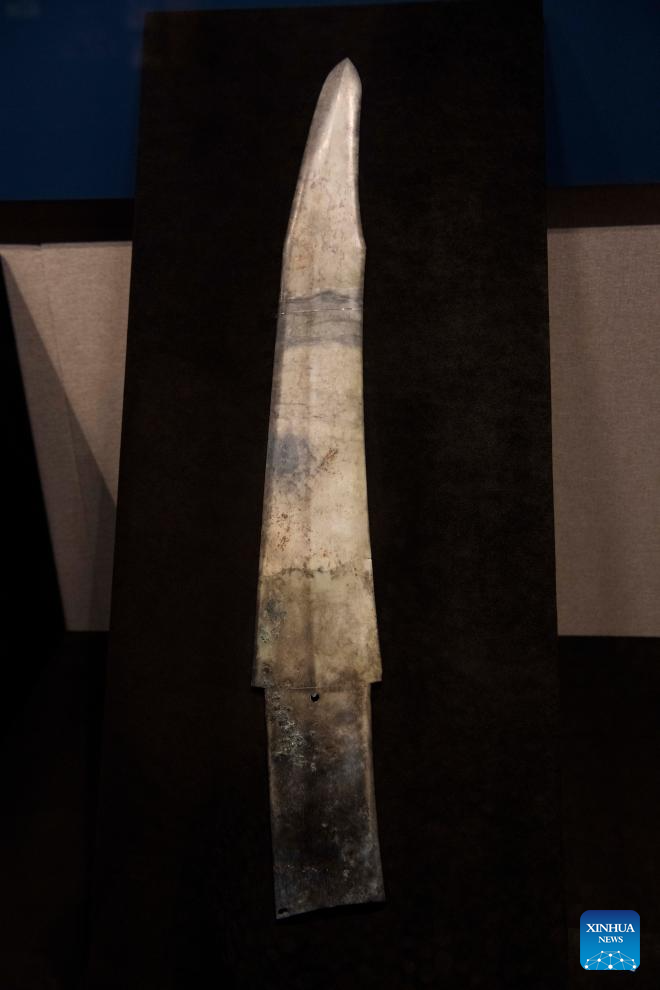 A jade dagger-axe is displayed at the Sanxingdui Museum in Guanghan City, southwest China's Sichuan Province, July 22, 2024. (Xinhua/Tang Wenhao)