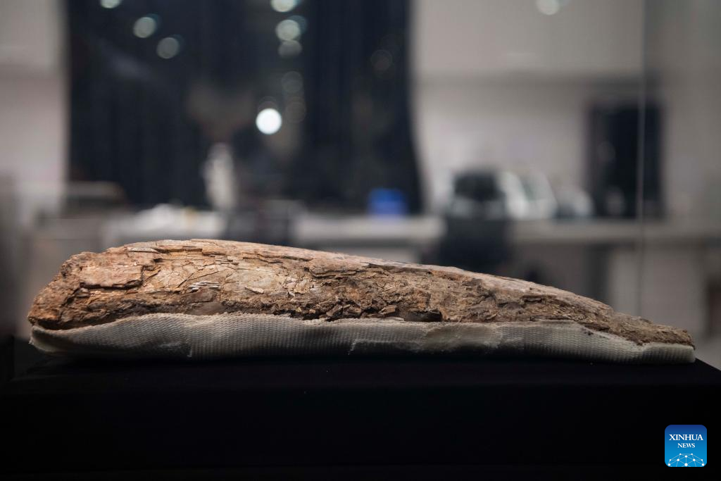 A restored elephant's tusk is displayed at the Sanxingdui Museum in Guanghan City, southwest China's Sichuan Province, July 23, 2024. (Xinhua/Wang Xi)