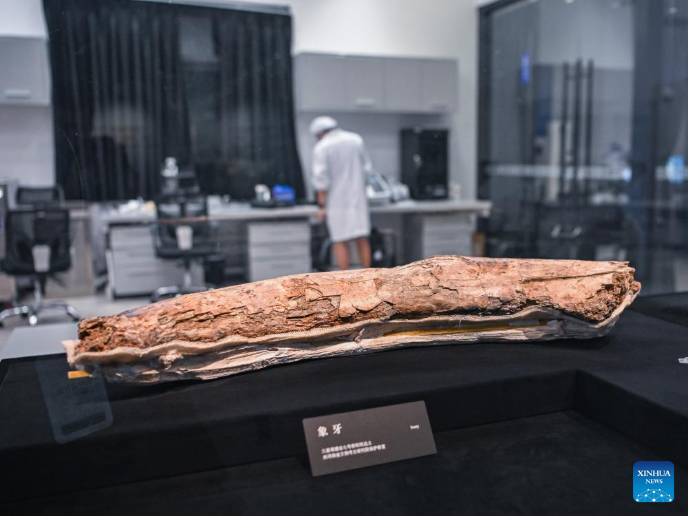 Ivory carving artifacts are displayed at the Sanxingdui Museum in Guanghan City, southwest China's Sichuan Province, July 23, 2024. (Xinhua/Wang Xi)