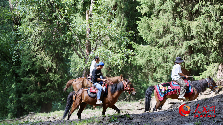 Tourists experience horse-riding in Kuerdening scenic area in Gongliu county, Ili Kazakh Autonomous Prefecture, northwest China's Xinjiang Uygur Autonomous Region. (People's Daily Online/Li Long)
