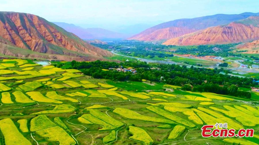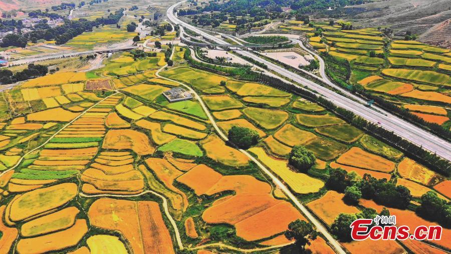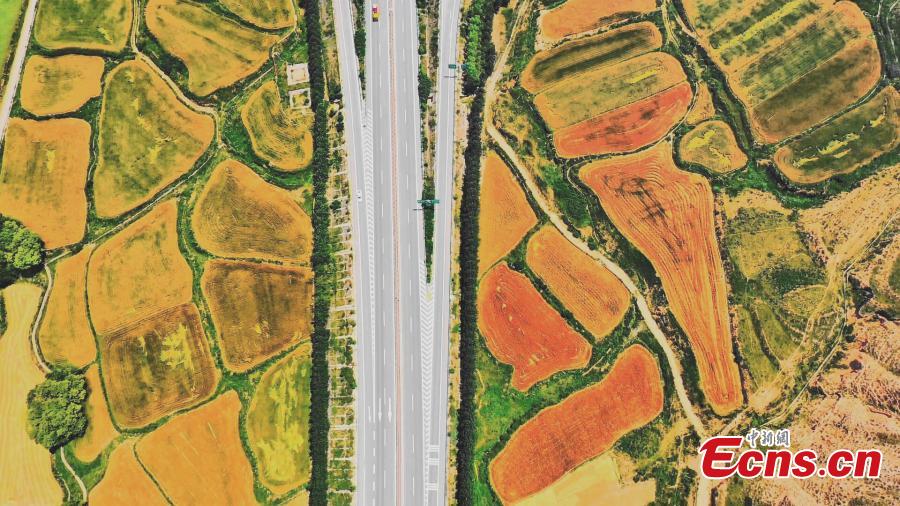 Colorful terraced fields lie on both sides of a highway in Xunhua Sala Autonomous County, northwest China's Qinghai Province. (Photo: China News Service/Ma Long)