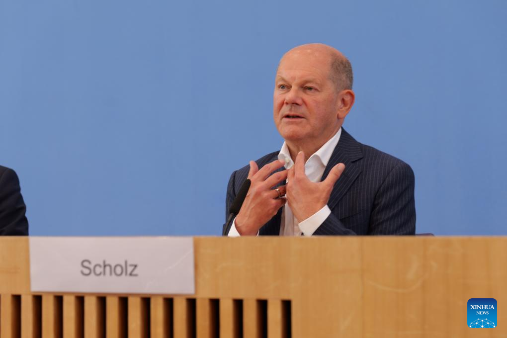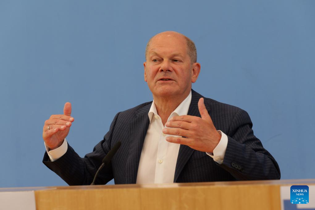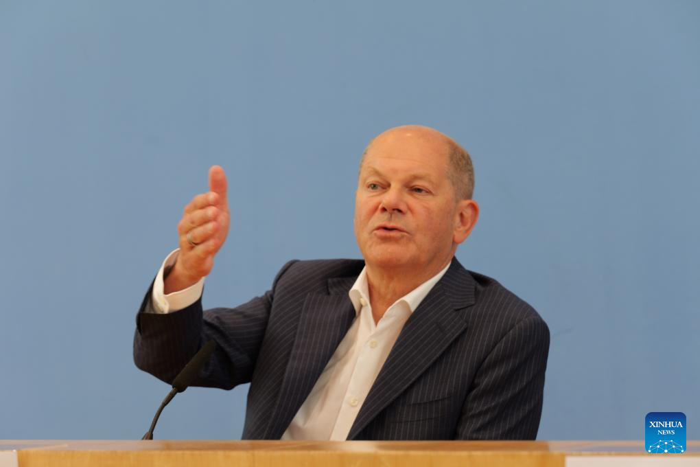 German Chancellor Olaf Scholz speaks at a press conference in Berlin, Germany, on July 24, 2024. Scholz on Wednesday expressed his willingness to run for a second term in the 2025 national elections. His official nomination by the Social Democratic Party (SPD) remains pending, however. (Xinhua/Li Hanlin)