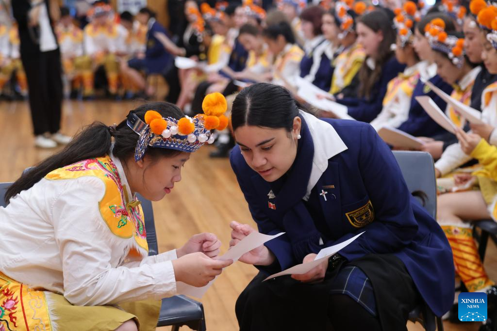 A student of Wellington East Girls' College teaches a member of China's Guangzhou Opera House Children's Choir a Maori song in Wellington, New Zealand, July 24, 2024. Members of Guangzhou Opera House Children's Choir visited Wellington East Girls' College in New Zealand on Wednesday, and held a joint concert with the high school's choir at the opening ceremony of the new semester of the school. (Photo by Meng Tao/Xinhua)