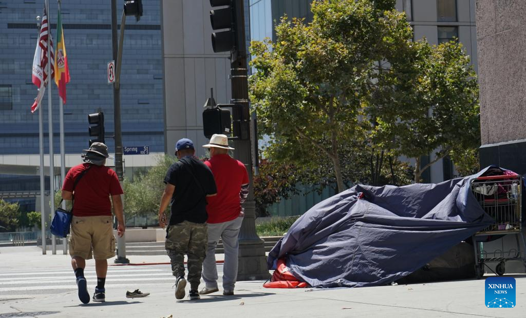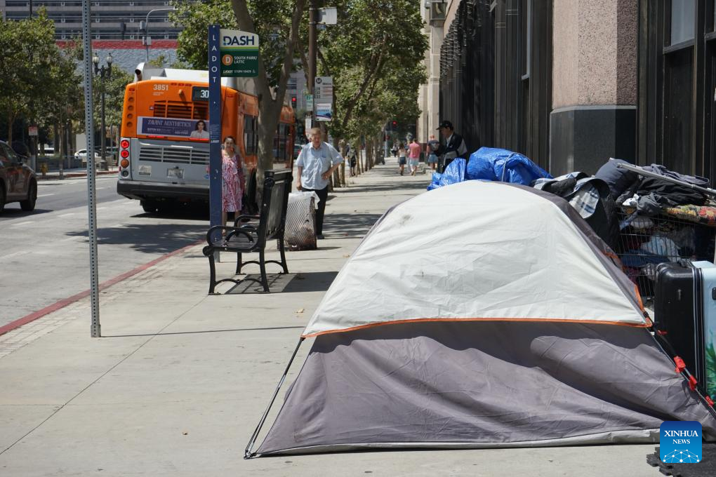 People walk past a tent of homeless people in downtown Los Angeles, California, the United States, on July 25, 2024. California governor Gavin Newsom issued an executive order on Thursday directing officials in the most populated U.S. state to urgently address homeless encampments. (Photo by Zeng Hui/Xinhua)