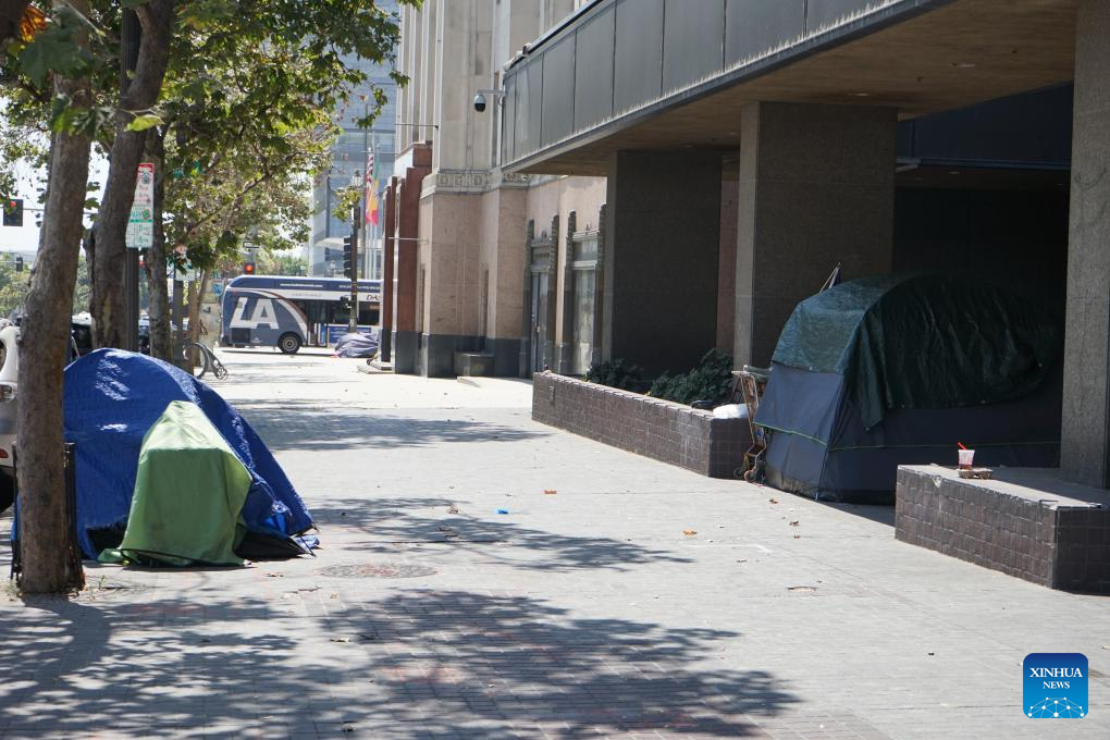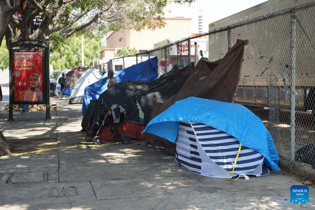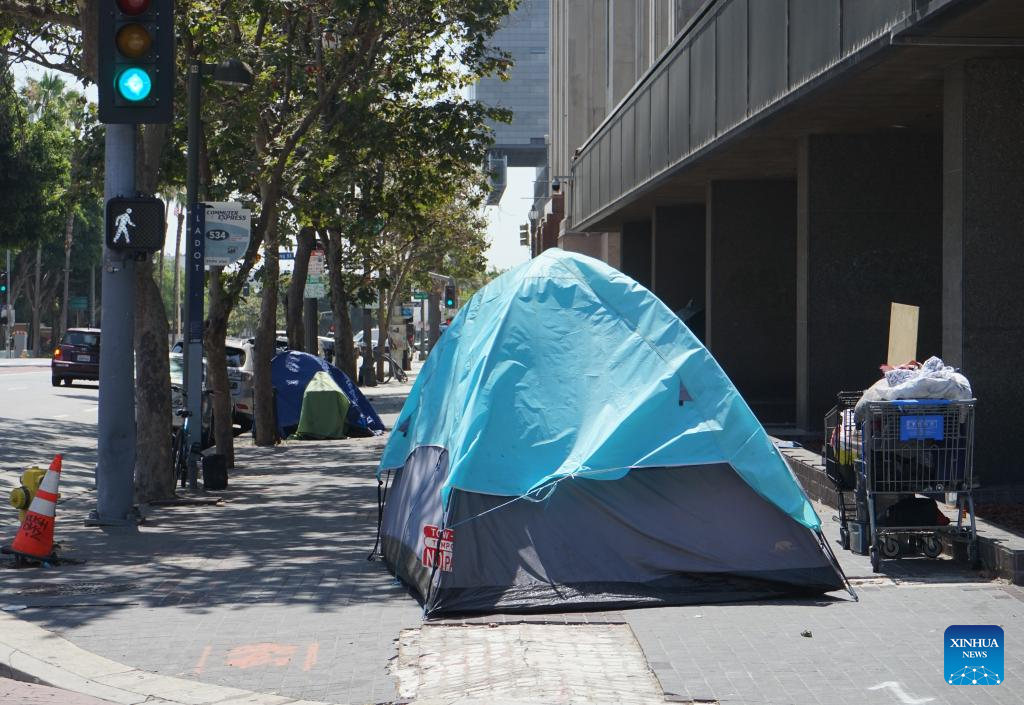 Tents of homeless people are seen in downtown Los Angeles, California, the United States, on July 25, 2024. California governor Gavin Newsom issued an executive order on Thursday directing officials in the most populated U.S. state to urgently address homeless encampments. (Photo by Zeng Hui/Xinhua)