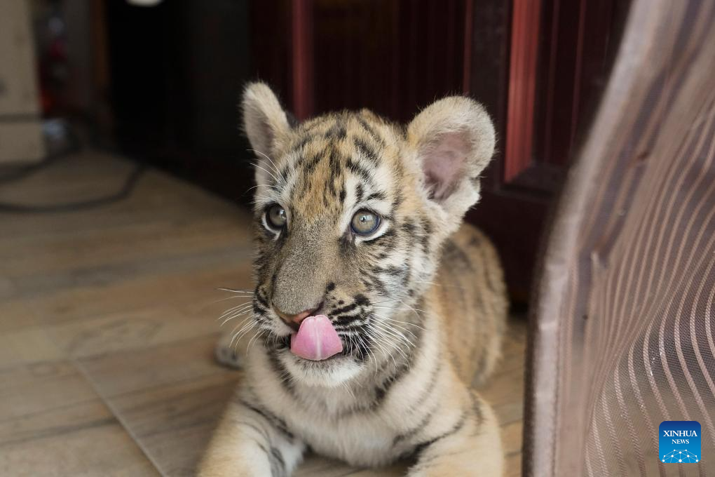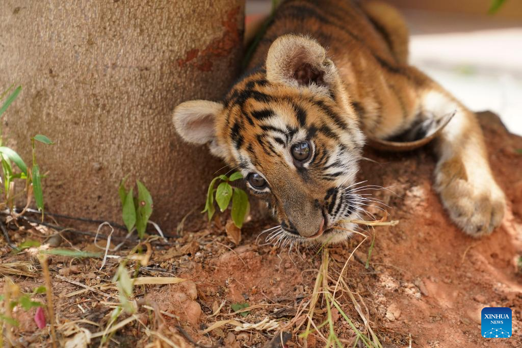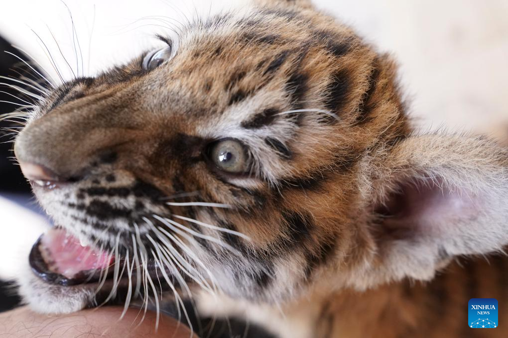 This photo taken on July 25, 2024 shows a Siberian tiger cub at Fuzhou Xian'gaishan wildlife zoo in east China's Jiangxi Province. (Xinhua/Zhou Mi)