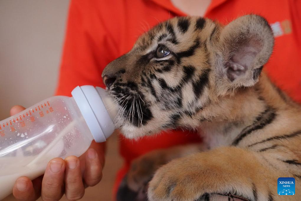 A keeper feeds milk to a Siberian tiger cub at Fuzhou Xian'gaishan wildlife zoo in east China's Jiangxi Province, July 25, 2024.?(Xinhua/Zhou Mi)
