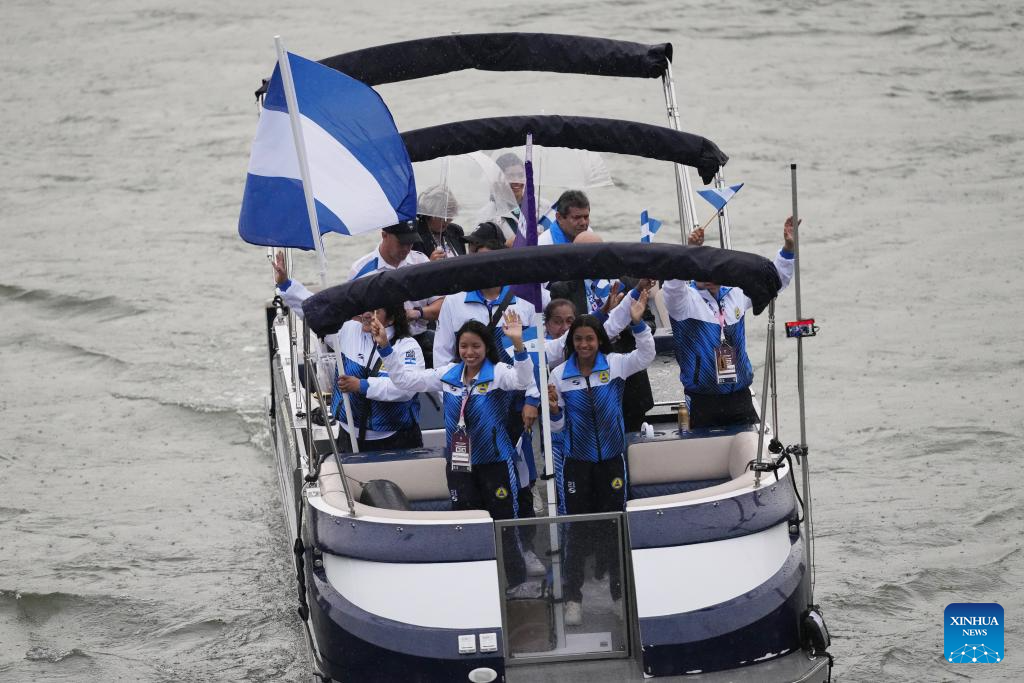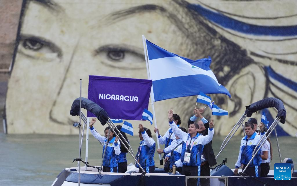 Members of the delegation of Nicaragua are seen during the opening ceremony of the Paris 2024 Olympic Games in Paris, France, July 26, 2024. (Xinhua/Wan Xiang)