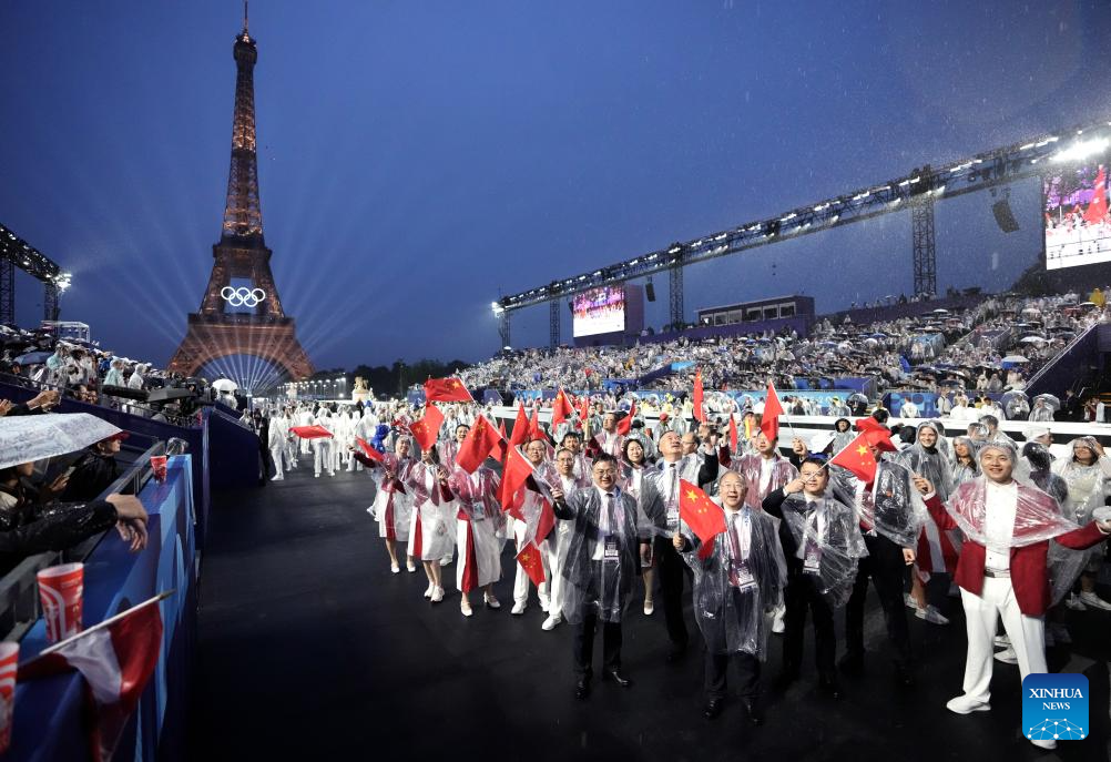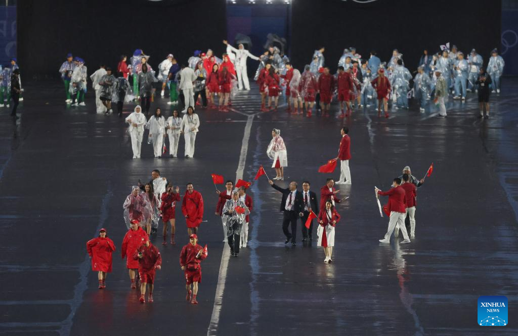 Members of the Chinese delegation attend the opening ceremony of the Paris 2024 Olympic Games in Paris, France, July 26, 2024. (Xinhua/Gao Jing)