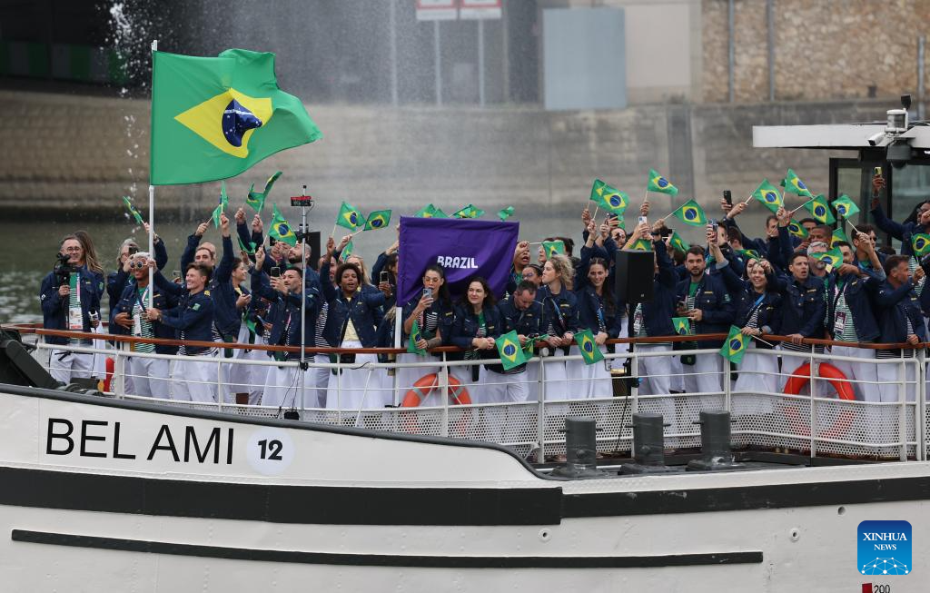 Members of the delegation of Brazil are seen during the opening ceremony of the Paris 2024 Olympic Games in Paris, France, July 26, 2024. (Xinhua/Guo Yu)