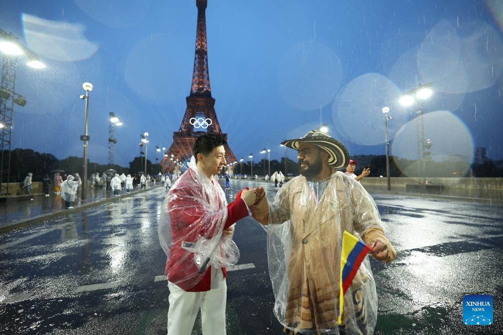 Chinese table tennis player Ma Long (L), also one of the flag bearers of China at the opening ceremony of the Paris Olympic Games, bumps fist with a member of the delegation of Team Colombia during the opening ceremony of the Paris 2024 Olympic Games in Paris, France, July 26, 2024, as the Eiffel Tower is seen in the background. (Xinhua/Li Ming)