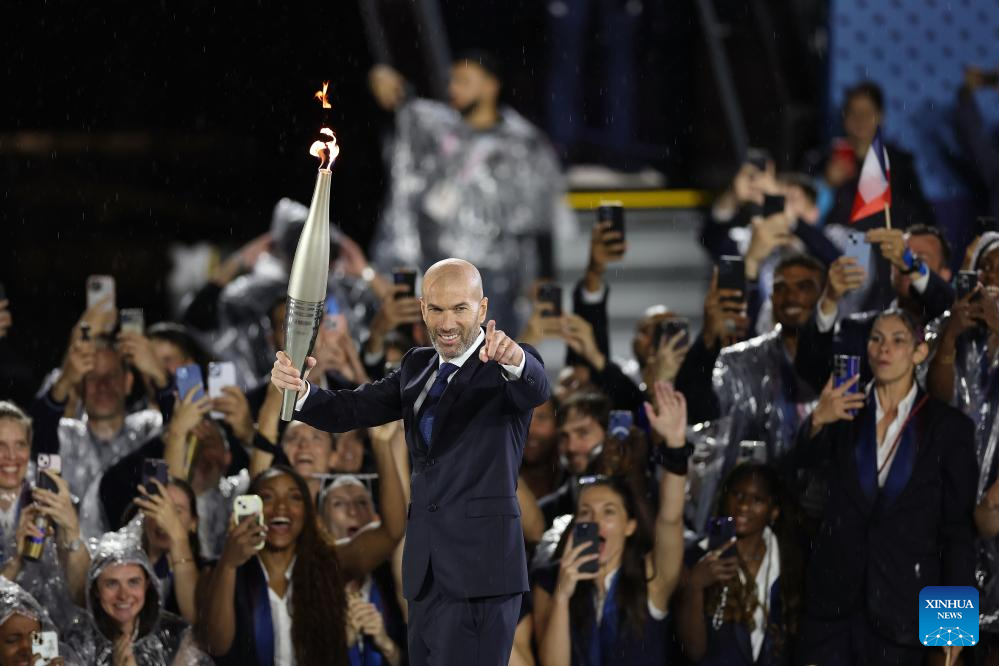 Former French football player Zinedine Zidane carries the Olympic flame at the Trocadero Stadium during the opening ceremony of the Paris 2024 Olympic Games in Paris, France, July 26, 2024. (Xinhua/Li Ying)