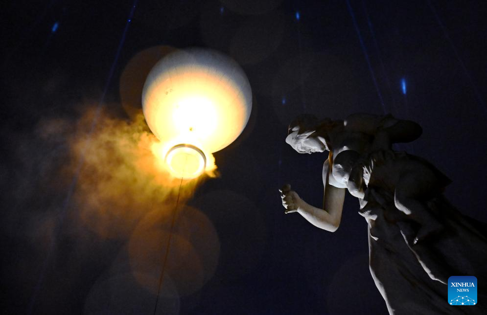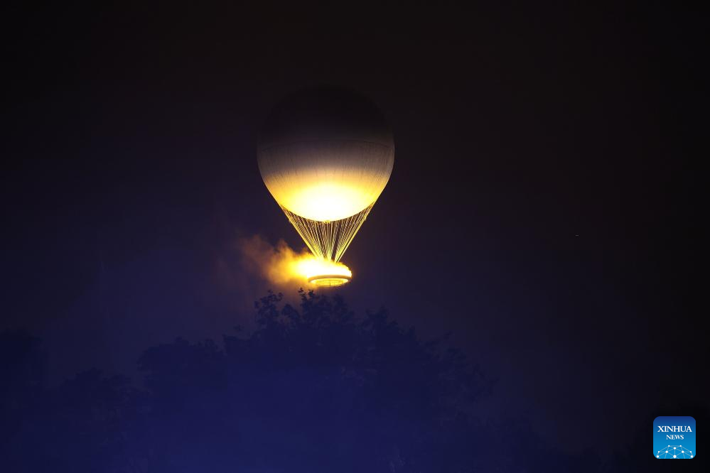 The Olympic cauldron, with the flame lit, lifts off while attached to a balloon during the opening ceremony of the Paris 2024 Olympic Games in Paris, France, July 26, 2024. (Xinhua/Liu Dawei)