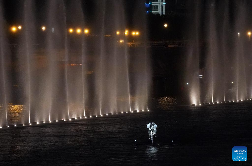 Floriane Issert, a Gendarmerie non-commissioned officer of the National Gendarmerie, rides on a mechanical metal horse up the Seine river, wrapped in the Olympic flag during the opening ceremony of the Paris 2024 Olympic Games in Paris, France, July 26, 2024. (Xinhua/Wan Xiang)