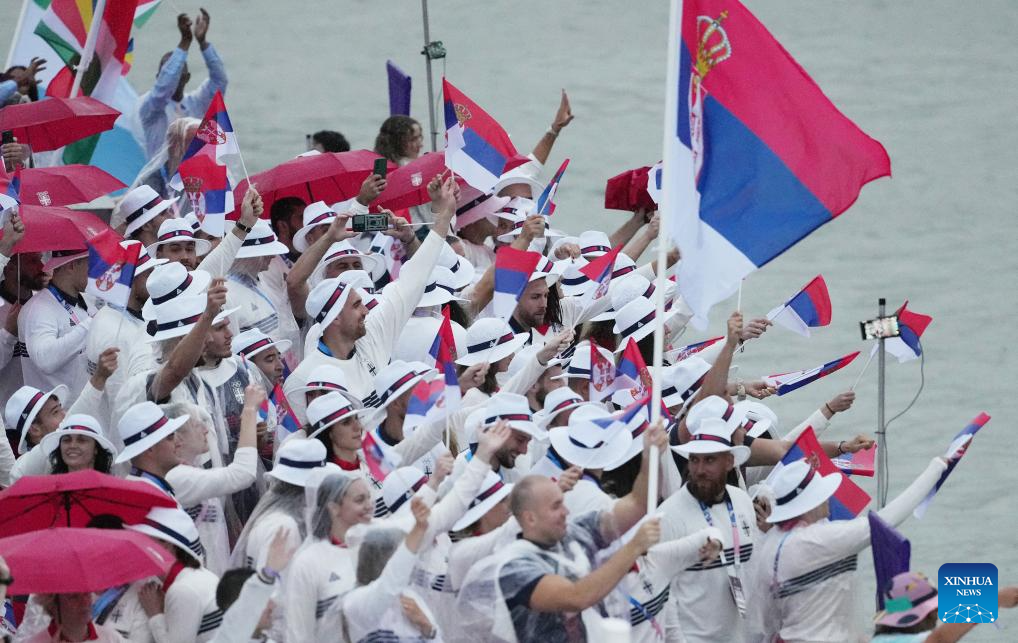 Members of the Serbian delegation attend the opening ceremony of the Paris 2024 Olympic Games in Paris, France, July 26, 2024. (Xinhua/Ren Pengfei)