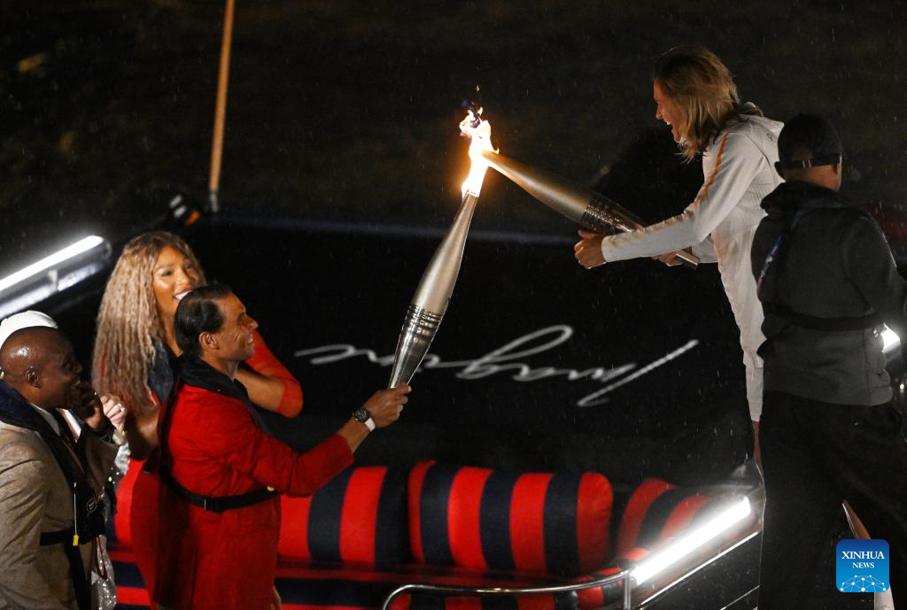 Spanish tennis player Rafael Nadal holds the Olympic torch next to U.S. athlete Carl Lewis, Romanian gymnast Nadia Comaneci and U.S. tennis player Serena Williams on the river Seine during the opening ceremony of the Paris 2024 Olympic Games in Paris, France, July 26, 2024. (Xinhua/Li Gang)