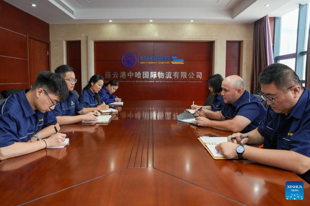 Bedelov Azilkhan (2nd R) and his colleagues have a meeting at the China-Kazakhstan (Lianyungang) Logistics Cooperation Base in Lianyungang, east China's Jiangsu Province, July 25, 2024. (Xinhua/Li Bo)