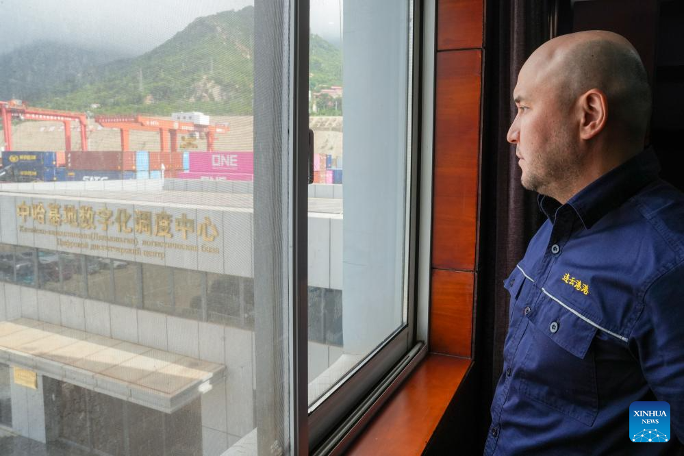Bedelov Azilkhan looks out the window at his office at the China-Kazakhstan (Lianyungang) Logistics Cooperation Base in Lianyungang, east China's Jiangsu Province, July 25, 2024. (Xinhua/Li Bo)