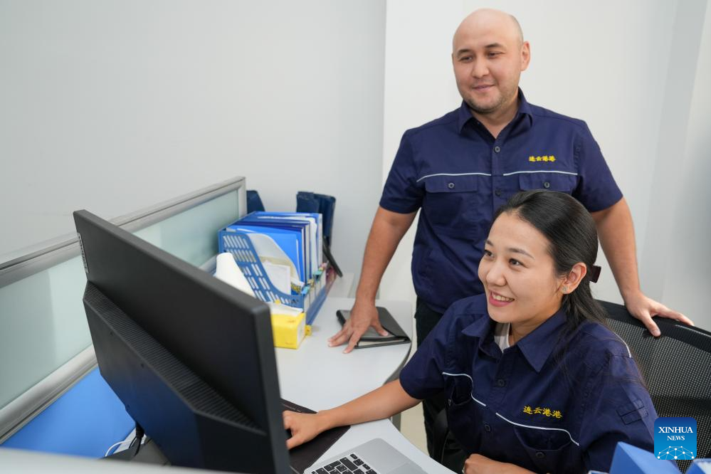 Bedelov Azilkhan (rear) and his colleague work at the China-Kazakhstan (Lianyungang) Logistics Cooperation Base in Lianyungang, east China's Jiangsu Province, July 25, 2024. (Xinhua/Li Bo)