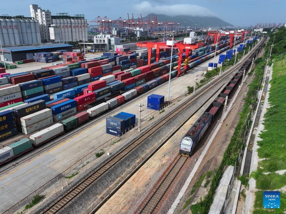 An aerial drone photo shows a container yard at the China-Kazakhstan (Lianyungang) Logistics Cooperation Base in Lianyungang, east China's Jiangsu Province, July 25, 2024. (Xinhua/Li Bo)