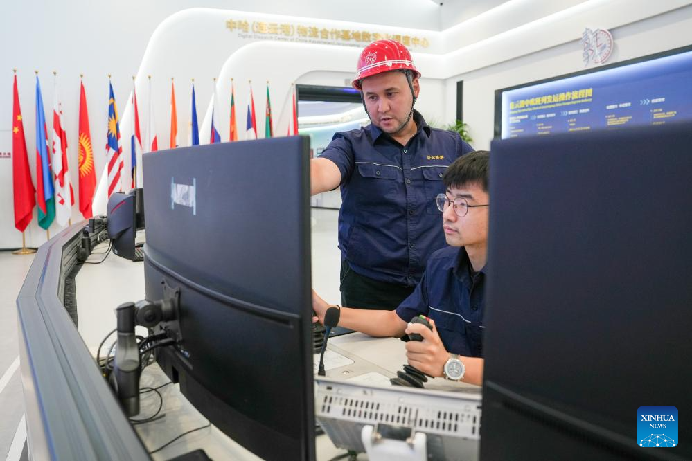 Bedelov Azilkhan (R) and his colleague monitor a container yard at the China-Kazakhstan (Lianyungang) Logistics Cooperation Base in Lianyungang, east China's Jiangsu Province, July 25, 2024. (Xinhua/Li Bo)