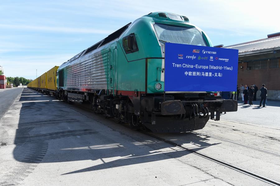 This photo taken on May 8, 2024 shows a commemorative China-Europe freight train linking Yiwu of east China's Zhejiang Province and Madrid of Spain for the 10th anniversary of operation preparing to depart in Madrid, Spain. (Photo by Gustavo Valiente/Xinhua)
