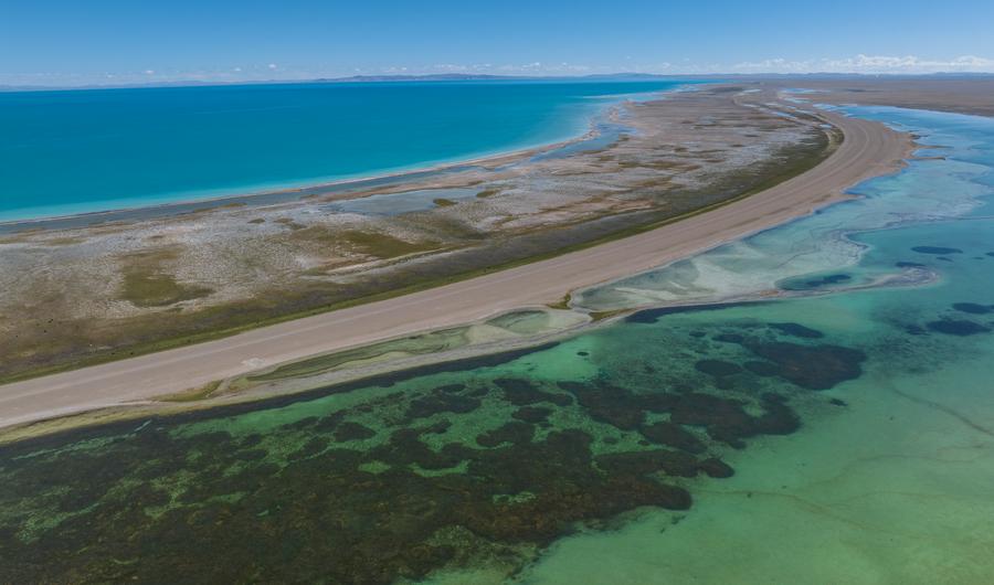 An aerial drone photo taken on June 22, 2024 shows the scenery of Serling Tso Lake in southwest China's Xizang Autonomous Region. (Xinhua/Tenzin Nyida)