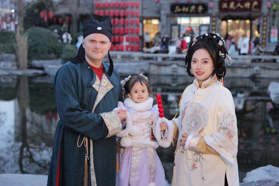 Daniel Welker and his family pose for a photo at the Luoyi ancient city in Luoyang, central China's Henan Province, Jan. 11, 2024. (Xinhua)